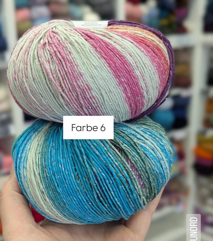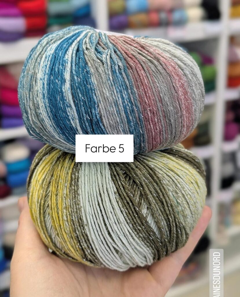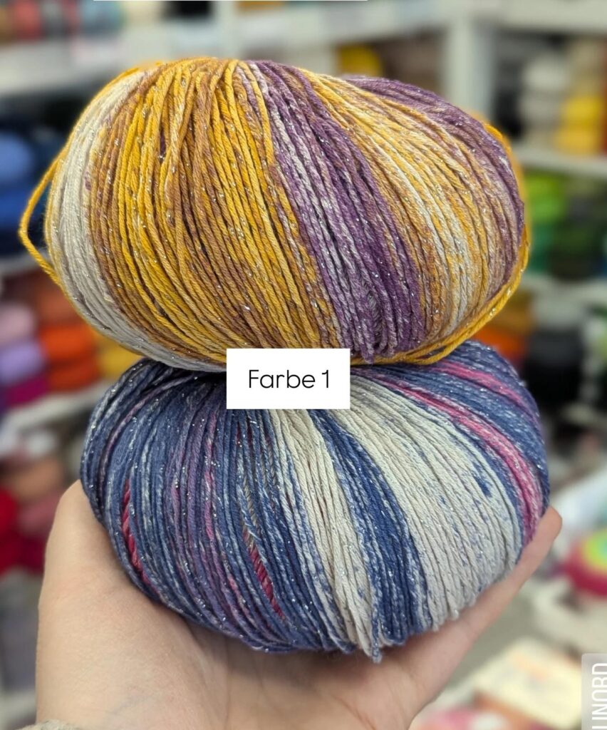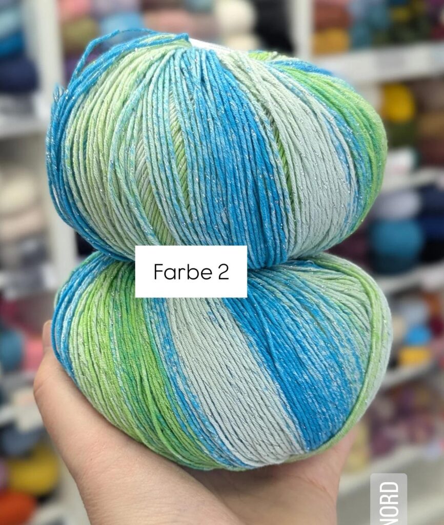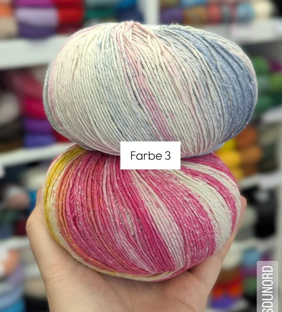 Das Garn besteht zu 93% aus Baumwolle und hat einen dezenten Glitzerfaden, der dem Ganzen das gewisse Etwas verleiht.